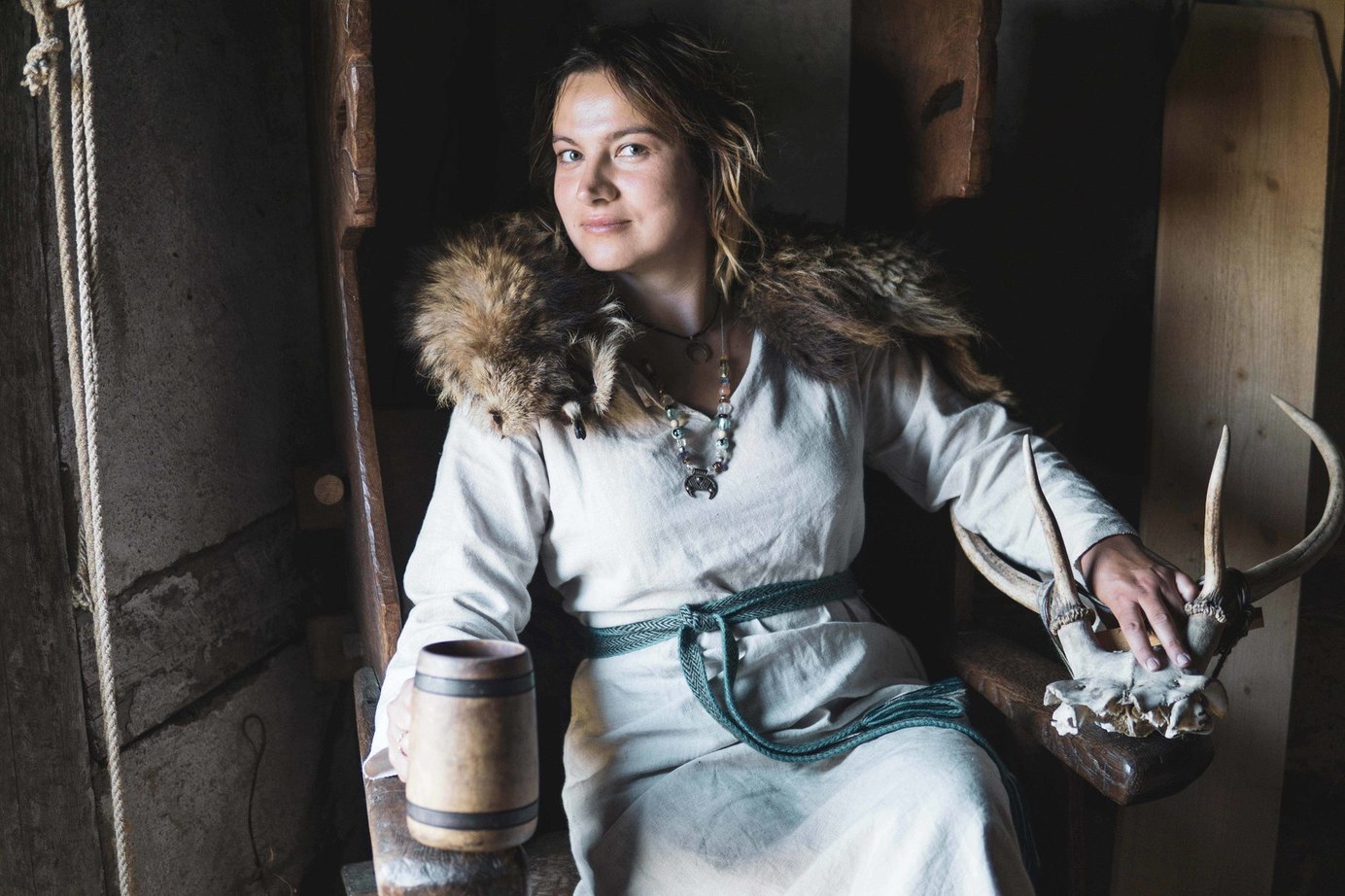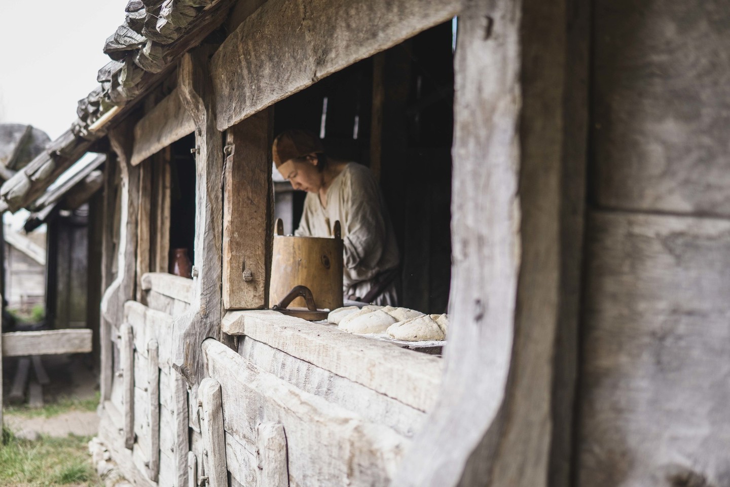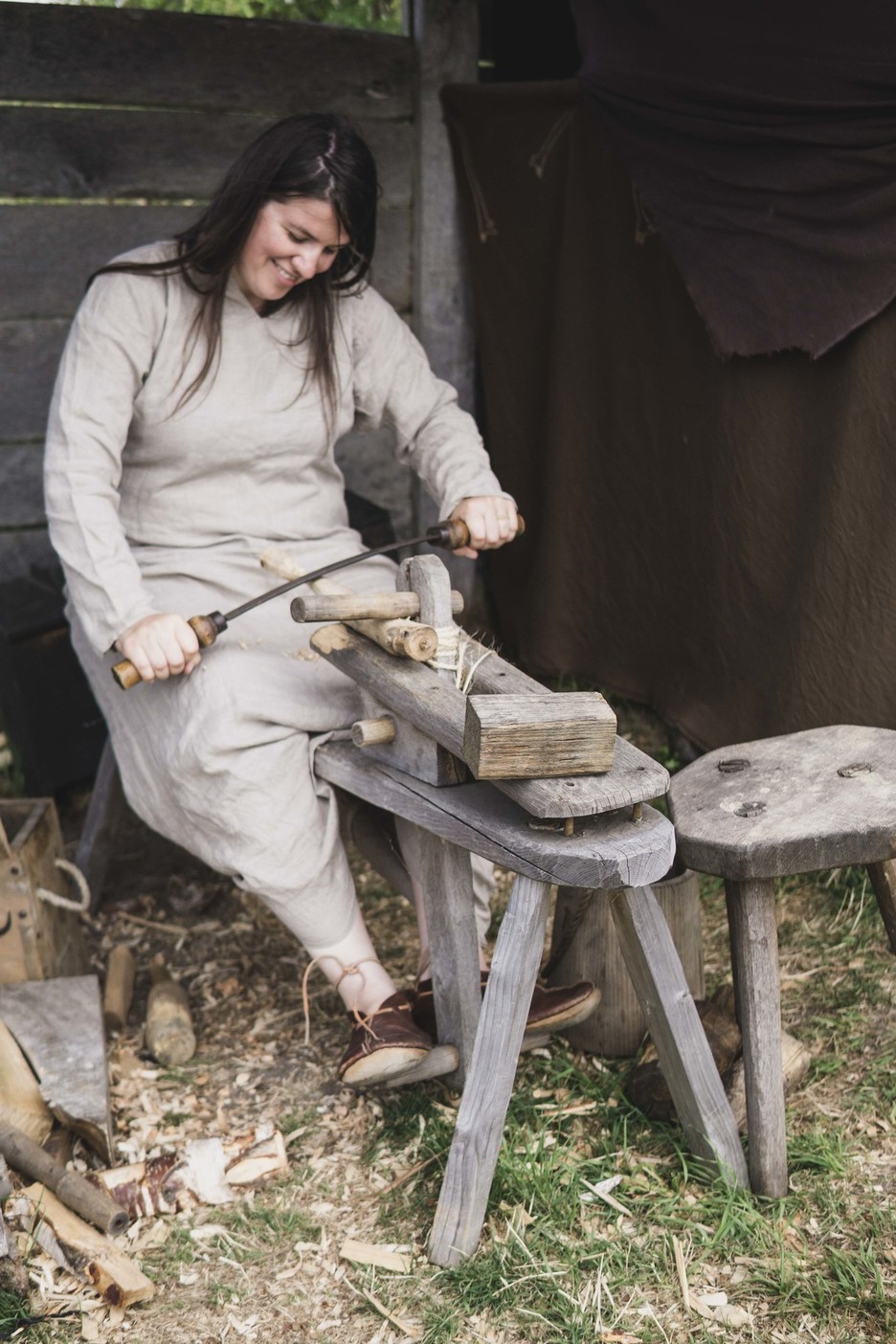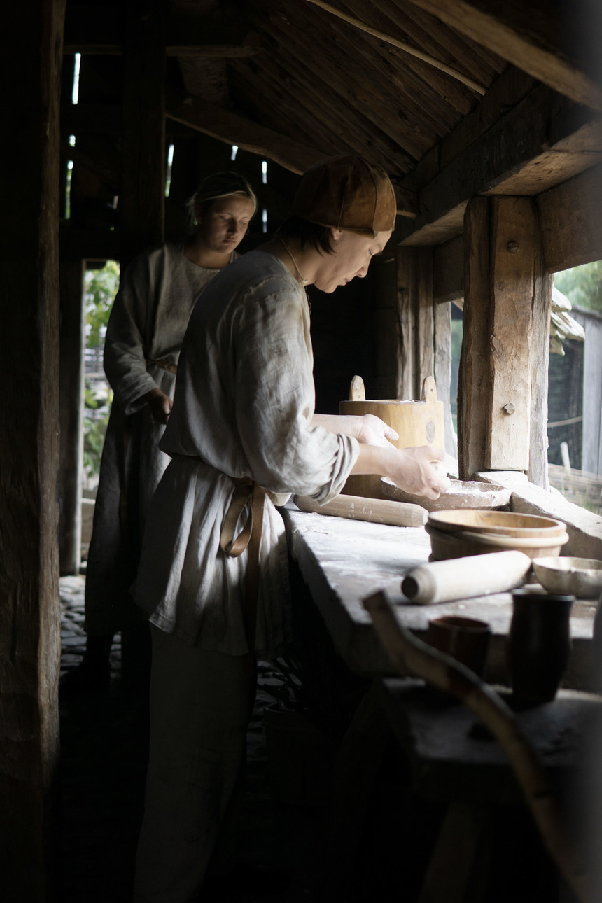 Foteviken is a place where reenactors can come and stay for a few days during the summer season. During our visit we volunteered as educators and craftsmen. We lived in a merchant’s hut, breathing in the pleasant, leisurely life of a medieval village. Ania Kępa showed visitors naalbinding, i.e. the ancient technique of needle binding used to create hats, mittens and socks. Ania Raczkowska “took over” the woodworking workshop, and Emilia Pawłusz wove belts on tablets in the weaver’s hut. We had a great time interacting with tourists, other volunteers and museum staff.